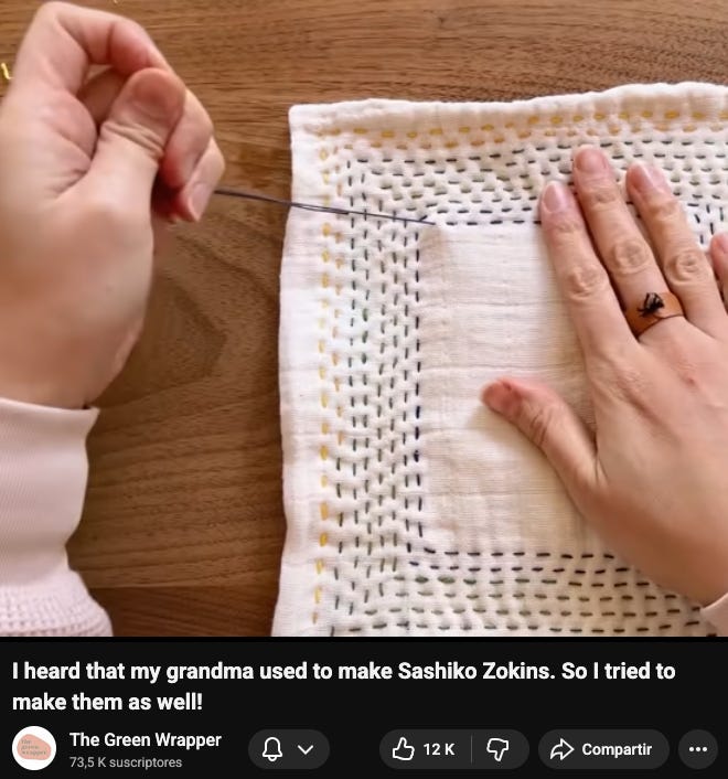 Yo llegué a esta técnica preciosa a través del canal de youtube The Green Wrapper como una forma de enmendar de manera bonita los tejidos que se rompían o aprovecharlos reforzándolos cosiendo varias capas juntas y luego utilizándolos para tareas domésticas.