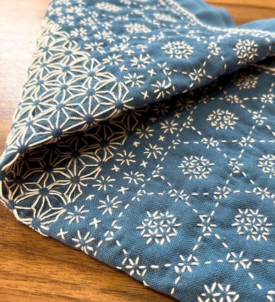 Cuando fui a Japón busqué hilo y tela para iniciarme en este bordado porque sí, no nos sirve cualquier hilo de bordar tipo DMC que tiende a separarse en hebras para elegir el tipo de grosor que queremos para nuestro bordado, no así el sashiko que está hecho para usarse sin separarse, además está la diferencia estética: el hilo para sashiko tiene un acabado mate y una apariencia más rústica. Y la tela, que suele ser de algodón y teñida en añil que era un tinte asequible que fortalecía las fibras. En fin, terminé comprando muy a gusto un par de monederitos ya bordados en una tienda local.